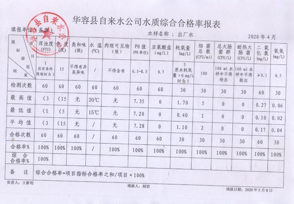 华容县自来水公司2020年4月出厂水水质综合合格率报表