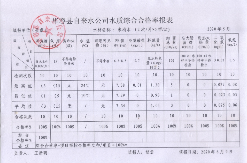 华容县自来水公司2020年5月末梢水水质综合合格率报表