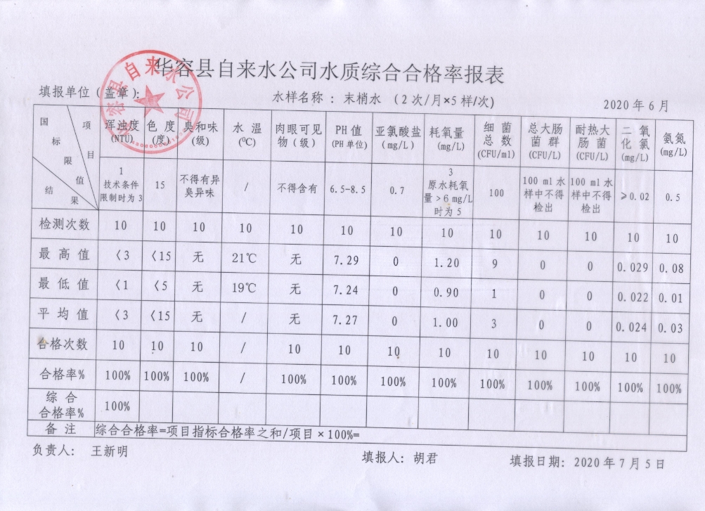 华容县自来水公司2020年6月末梢水水质综合合格率报表