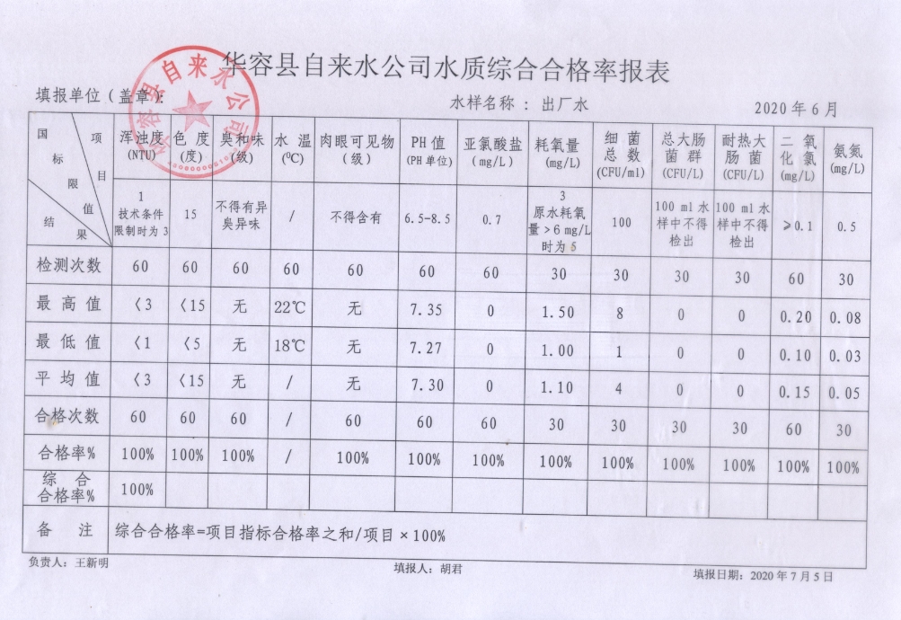 华容县自来水公司2020年6月出厂水水质综合合格率报表