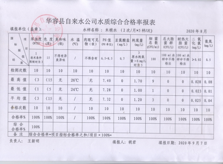 华容县自来水公司2020年8月末梢水水质综合合格率报表