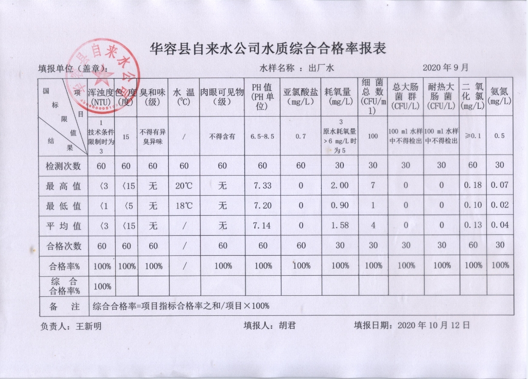 华容县自来水公司2020年9月出厂水水质综合合格率报表
