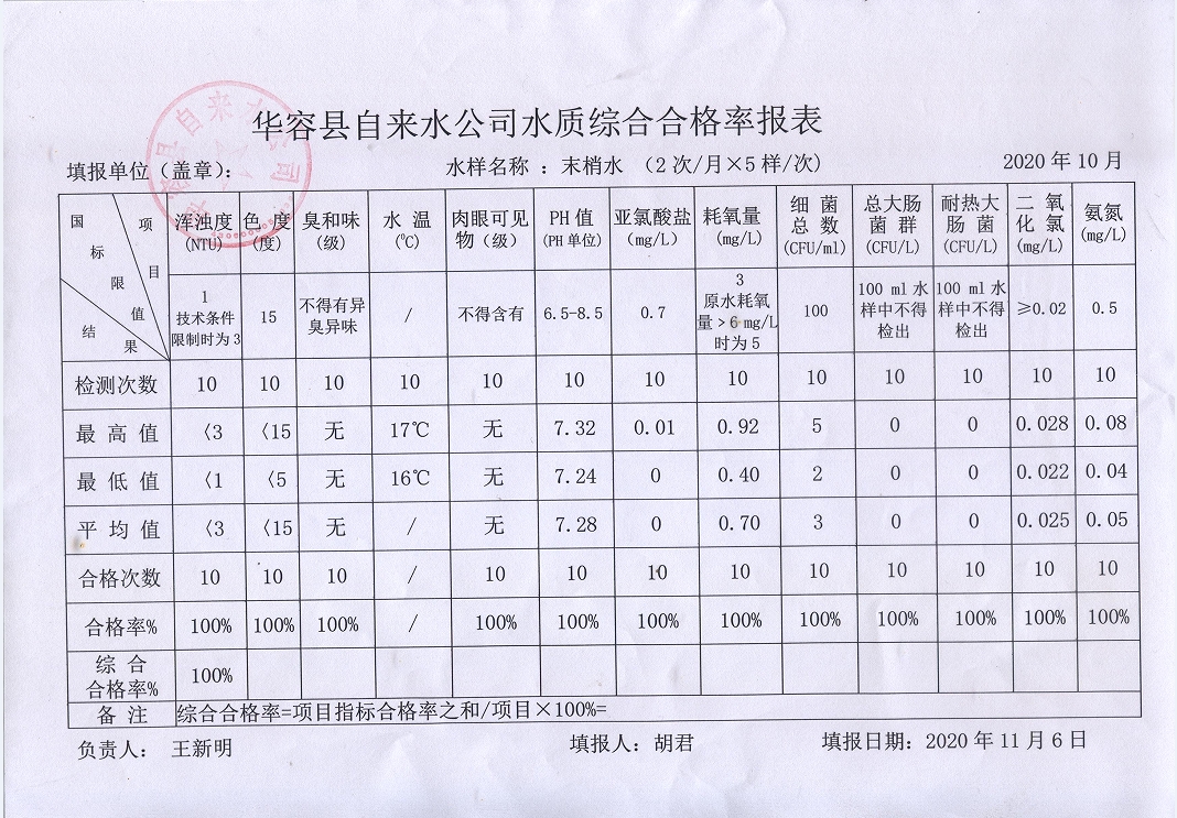 华容县自来水公司2020年10月末梢水水质综合合格率报表