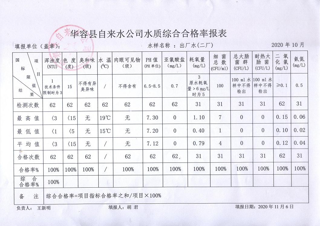 华容县自来水公司2020年10月出厂水水质综合合格率报表 (图)