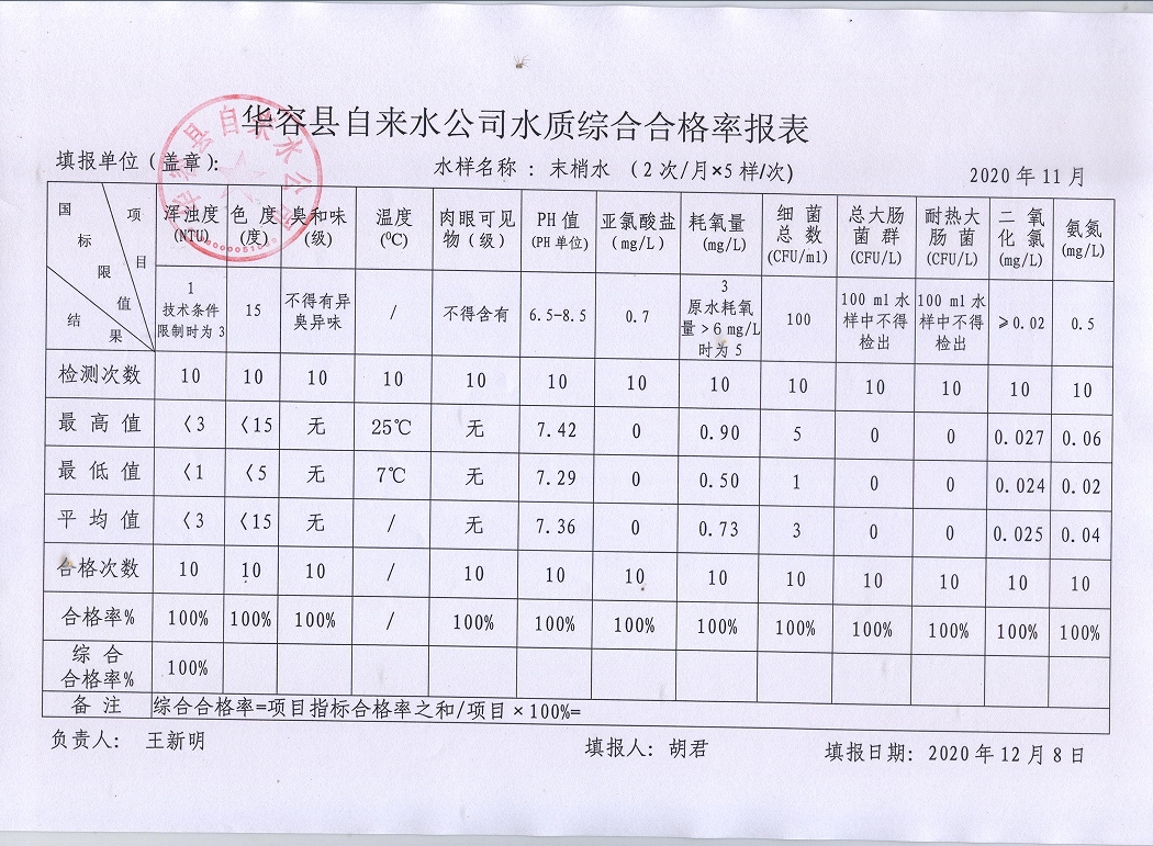 华容县自来水公司2020年11月末梢水水质综合合格率报表