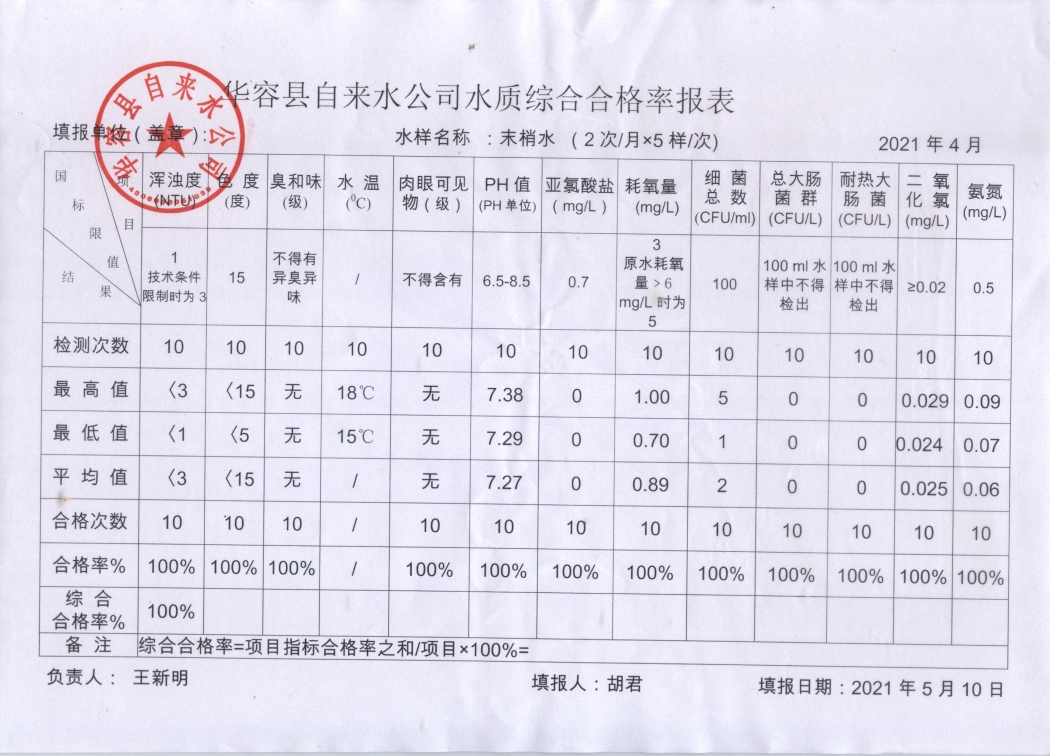 华容县自来水公司2021年4月末梢水水质综合合格率报表