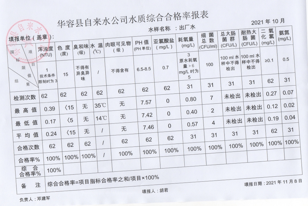 华容县自来水公司2021年10月出厂水水质综合合格率报表