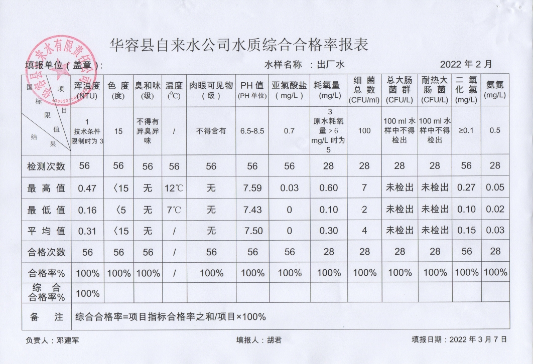 华容县自来水公司2022年2月出厂水水质综合合格率报表