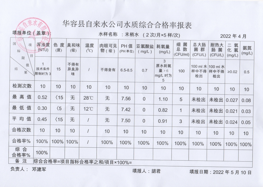 华容县自来水公司2022年4月末梢水水质综合合格率报表