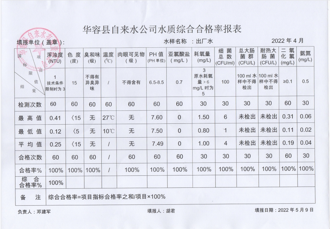 华容县自来水公司2022年4月出厂水水质综合合格率报表