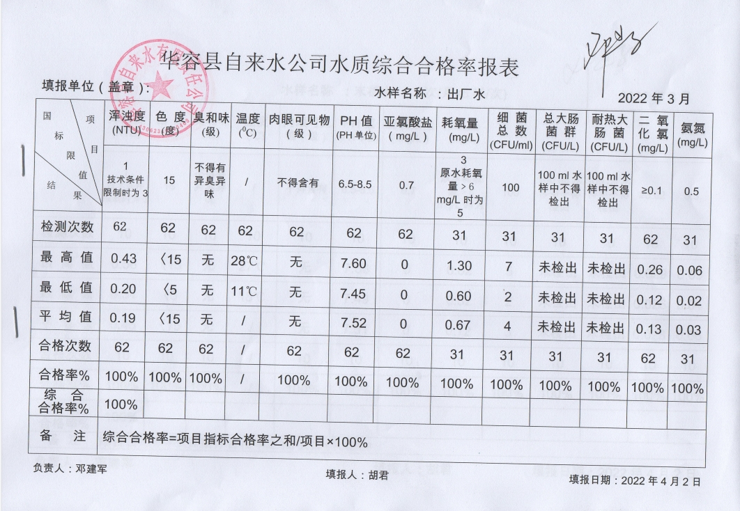 华容县自来水公司2022年3月出厂水水质综合合格率报表