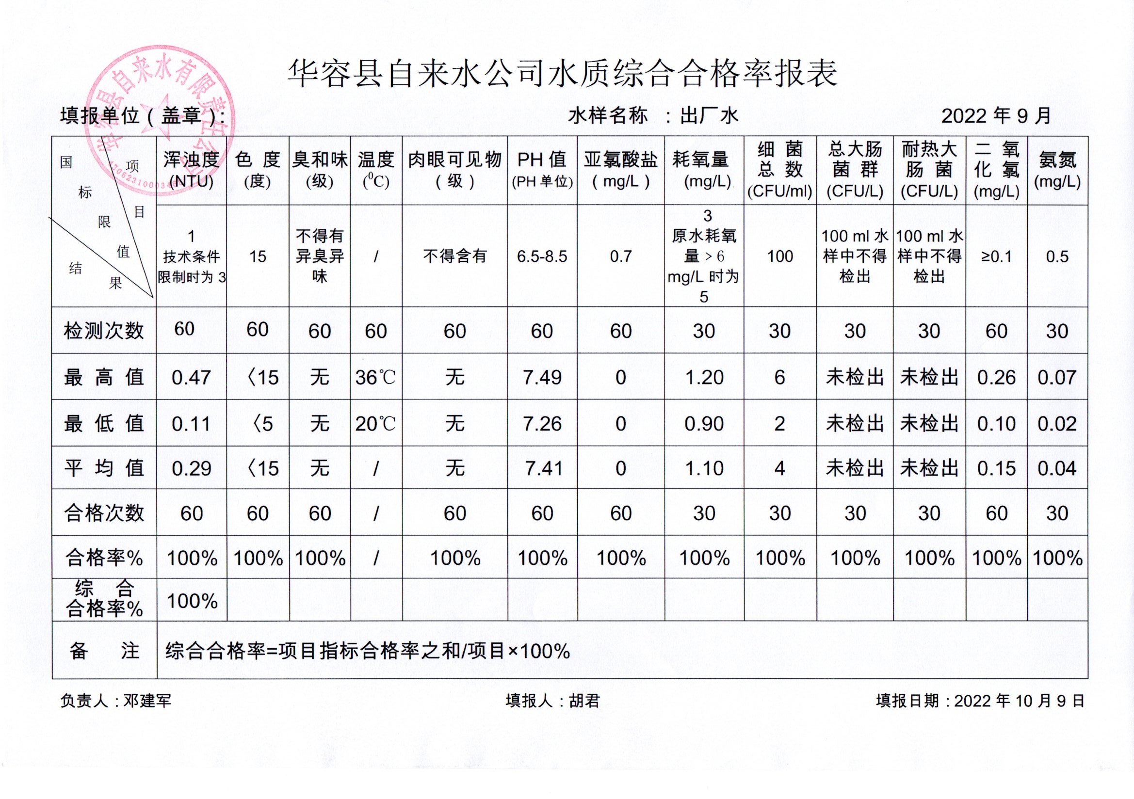 华容县自来水公司2022年9月出厂水水质综合合格率报表
