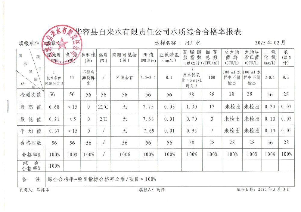 华容县自来水公司2025年2月出厂水水质综合合格率报表
