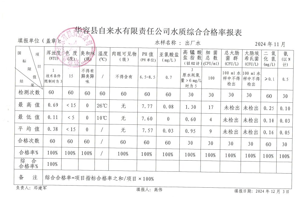 华容县自来水公司2024年11月出厂水水质综合合格率报表