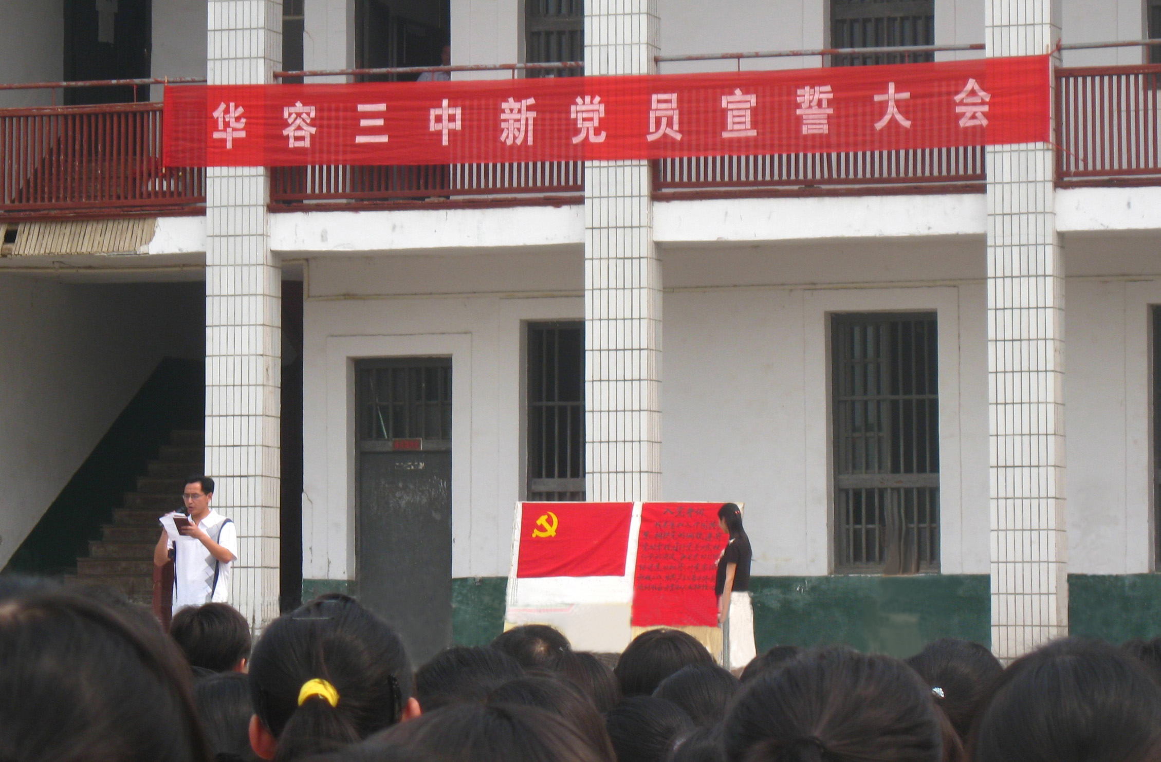 6月10日上午,华容三中党员宣誓大会在学校前操场隆重举行。全体师生参加了本次大会。大会在雄伟的《国际歌》中拉开序幕,3新党员面对鲜红的党旗向党许下了郑重的承诺,成为一名光荣的中国共产党党员。宣誓完毕,华容三中党总支副书记胡守重发表了讲话。向参加宣誓的同志表示衷心的祝贺,并希望全体党员严格要求自己,自觉加强党性的修养,勤奋学习,努力工作,勇于创新,不断进步,用优异的成绩回报答党的培养,为党做出新的贡献。