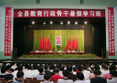 2008年8月20至22日,全县教育行政骨干暑假学习班在县影剧院隆重举行。这次学习班着重探讨教育发展转型期教育行政骨干队伍建设,主题为整顿作风,规范管理,提升素质,鼓舞士气。20日,副县长向阳作了动员报告,副局长周金华作了作风讲评报告,宣读了《关于加强领导班子自身建设的决定》、《关于加强机关干部作风建设的决定》等11项规章制度,教育行政骨干进行了分组讨论;21日,县委常委、县纪委书记余泽世就党风廉政建设作了重要讲话,局长、党委书记黎华平作了工作报告,对今年上半年教育工作进行了认真地总结,进一步明确了今后的工作目标,对当前的队伍建设、制度建设、教育改革等提出了具体的要求,副局长汪跃进就规范教育行政行为作了讲话,教育行政骨干进行了分组讨论;22日,教育管理专家进行了专题讲座,黄世田等9位教育行政骨干作了表态发言。会后,副局长吴汉秋讲了开学工作意见。全县教育行政干部共381人参加了会议。