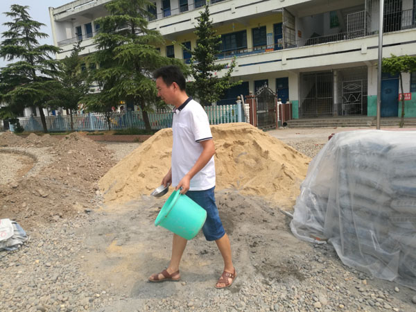 除了操场改造及综合楼的建设,还有校门、门卫室、宣传栏的改建,这些都是由竺抓纲老师跟踪负责。由于工作忙,他舍弃了对妻儿的照顾,整整24天,没有回过家。