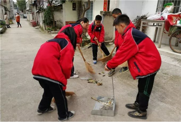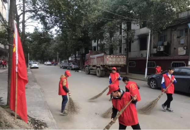 早晨,沐浴着阳光,同学们手握五星红旗,由易晓豪老师带领各班优秀团员到学校周边打扫街道卫生。瞧!孩子们已整装待发!