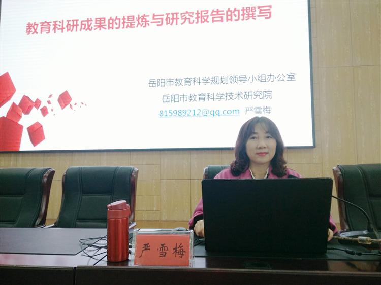 岳阳市教科院综合室主任、岳阳市教育科学规划办副主任、湖南省教育科学规划课题评审专家严雪梅作了题为《课题成果的梳理与研究报告的撰写》的专题讲座。
