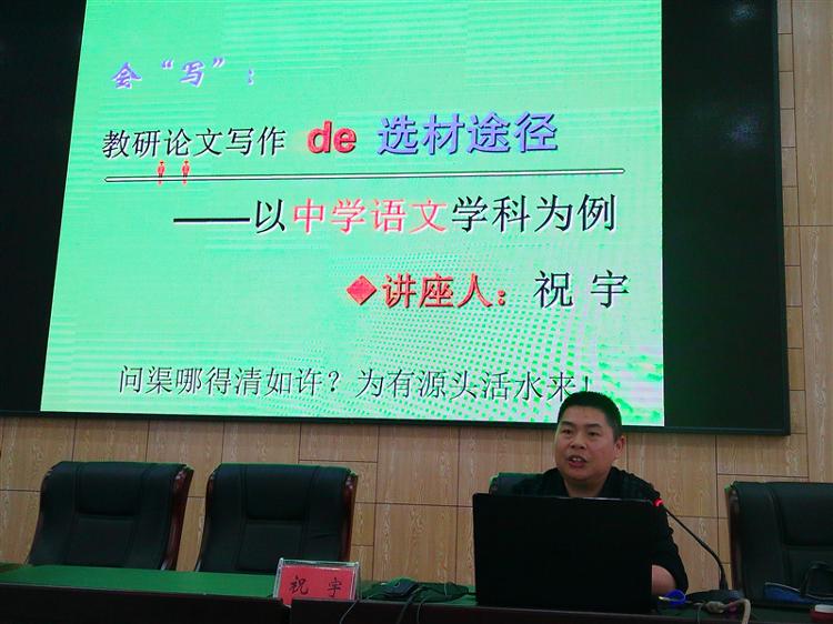 市教科院综合室副主任、市高中语文教研员祝宇以《教学论文的撰写及发表》为题进行了专题讲座。