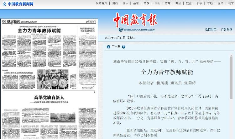 6月11日,《中国教育报》刊登《湖南华容推出20项具体举措,实施“训、育、管、用”系列举措——全力为青年教师赋能》长篇报道,推介我县青年教师培养经验。