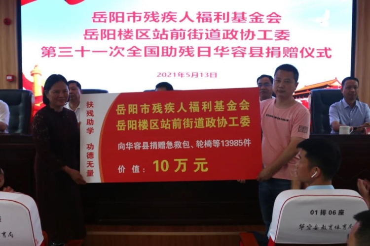 5月13日,岳阳市残疾人福利基金会、岳阳楼区站前街道政协工委来我县开展第三十一次全国助残日捐赠活动。市残联副理事长李正望,市残疾人福利基金会理事长、岳阳楼区政协常委陈丽湘,岳阳楼区站前街道政协工委主任史志华,局党委书记、局长龚成明,主任督学刘建新参加活动。