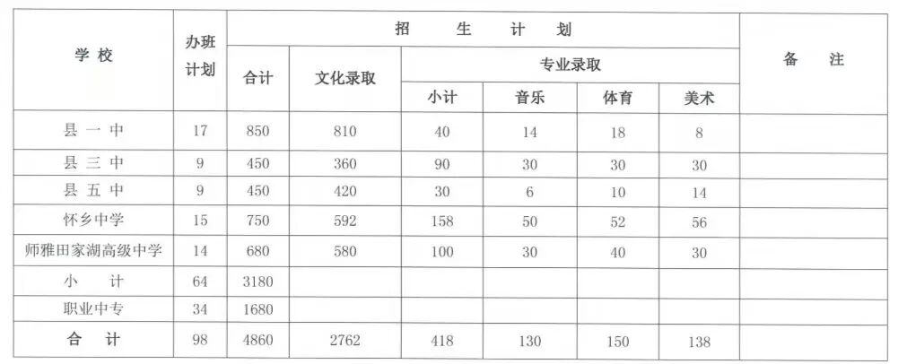 (1)招生计划。全县高中阶段学校招生计划为4860人,98个教学班。其中普通高中3180人,64个教学班;职业中专1680人,34个教学班(具体计划见附件4)。