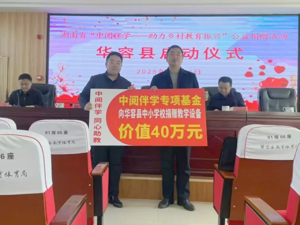 仪式上,县教体局党组书记、局长包金跃致欢迎辞,向中阅伴学专项基金的爱心捐助表示衷心感谢。中阅伴学专项基金秘书长徐豪向华容县捐赠价值40万元的捐赠物资,包括心理健康测评软件、教学资料、教学用无人机、书法教具以及6所学校编程智慧教室等。易湘禹向徐豪颁发荣誉证书。