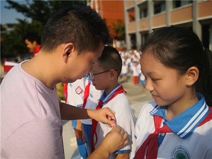 首先,少先队大队辅导员高涵老师宣读了本届少先队大队干部名单。随后,副校长包勇为队干部们授予标志。