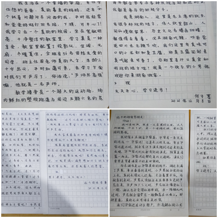 确定结对小伙伴之后,孩子们兴致勃勃地奋笔疾书。有的把“华容特色”介绍给远方素未谋面的小伙伴;有的向小伙伴诉说自己学习生活中的烦恼;有的介绍湖南的风土人情;有的介绍学校特色;有的分享自己新买的书,新看的电影,新认识的人;还有的向小伙伴发出邀请,期待见面……这种无声的交流,娓娓道来,没有家长和老师的教化,有的只是同龄人之间心与心的沟通。将那几页浸入情感的纸装进信封,仔细封好,递入邮筒,再通过邮递的方式到达对方手中,那种感觉赋予了文字本身特别的意义。