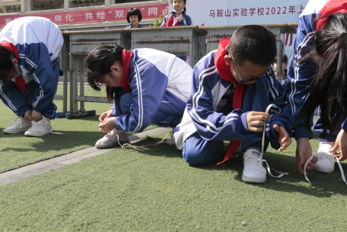 三年级比赛项目是系鞋带。“预备,开始!”老师一声令下,赛场上的小选手们立马进入到紧张激烈的竞争状态中,细长的带子在灵活的手指间来回飞舞,鞋带不停穿过球鞋,很快变成了一个个漂亮的“蝴蝶结”……短短的十几秒钟内,一只只小手高高的举了起来,示意完成比赛。