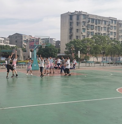 初中部进行的是篮球联赛。篮球场上,2007班和2005班的篮球健儿,你追我赶,10:8,15:17,20:19,比分始终跟的很紧。大家都看好2007班,但最终2005班发扬团结协作的精神,配合越来越默契,越打越顺手。比赛结束时,2005班以36:32赢得了比赛。