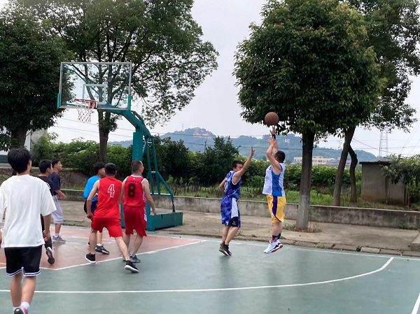比赛以班级为单位,每队同时派出三名学生和两名教师上场。伴随着裁判员一声哨响,场外观众的欢呼呐喊、加油助威此起彼伏,场上的气氛瞬间紧张且活跃起来,学生和老师们的脸上充满了专注的神情以及对胜利的渴望。队员们积极地抢球,娴熟的运球,漂亮的传球,果断突破精准投篮,动作一气呵成。双方你追我赶,紧咬比分,不断将比赛推向高潮,赢得场外观众们一阵又一阵的欢呼和呐喊。