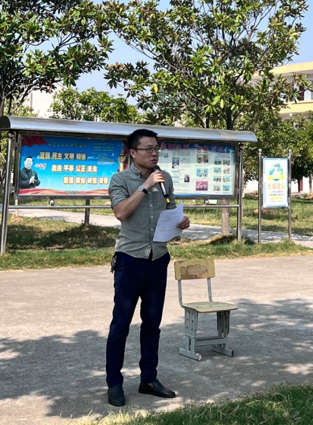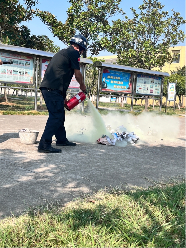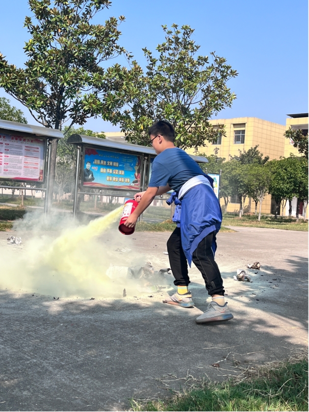 学校相关负责人就如何使用灭火器、如何正确掩住口鼻等自救技能进行实地操作和示范讲解。强调要根据风向抓住灭火黄金时间(1-3分钟),对准火源根部,进行“一提二拔三压四喷”四个规范操作,由于实际火灾现场的火势会蔓延,要与火源保持3-5米的距离。现场教师与同学们轮番上阵进行实操,学习掌握正确的灭火器使用方法。