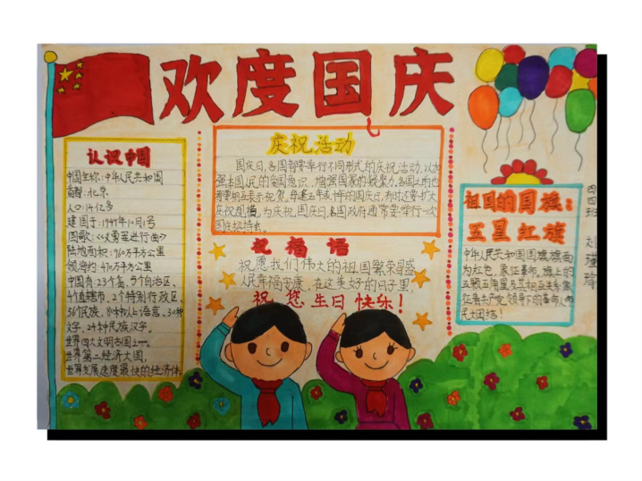 我的祖国,地大物博,风光秀美孕育了瑰丽的传统文化,大漠收残阳,明月醉荷花,广袤大地上多少美丽的景色在熠熠闪烁。四年级的孩子们,拿起他们的画笔描绘祖国美好画卷,制作《欢度国庆》手抄报,祝福祖国繁荣富强。