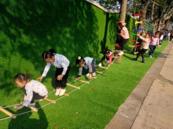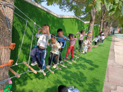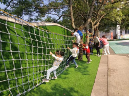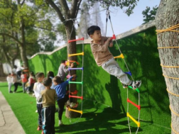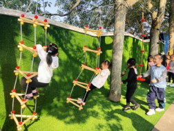 “安吉游戏”时间,欢声笑语响彻幸福中心幼儿园的各个角落。操场上,孩子们自由选择游戏玩具:走扁带、带扶手荡桥、爬梯、攀爬网、小圆盘爬绳、大小圆盘爬绳、吊环、圆筒、组合玩具等,根据自己的想象积极动手、动脑,在与材料的互动过程中不断地探索、调整、尝试、实践,用自己的方式寻找不同的玩法!