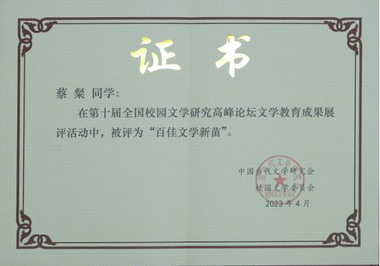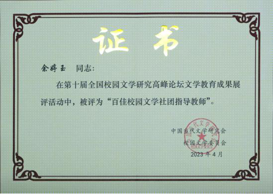 据了解,在本届文学教育成果展评活动中,除云帆文学社获得国字号荣誉外,余婷玉老师被评为“百佳校园文学社团指导教师”。