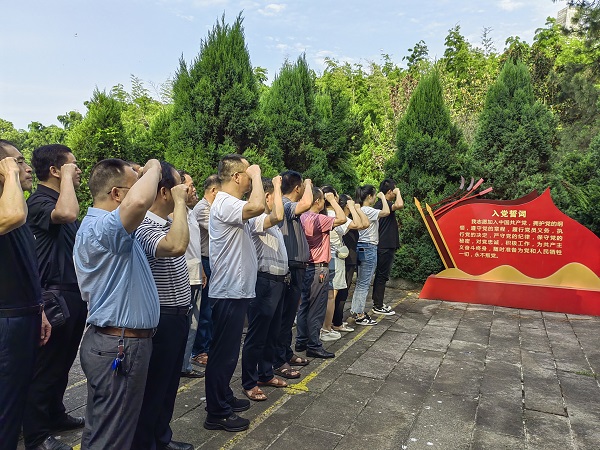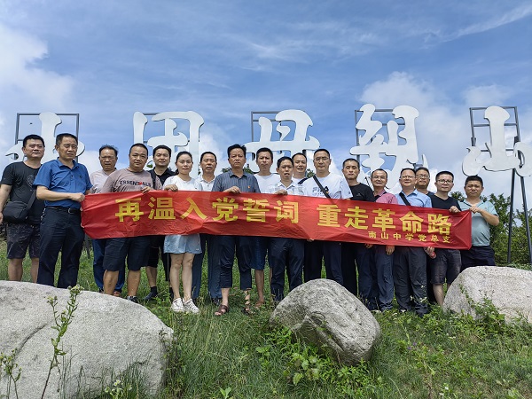 在烈士陵园何长工雕像前,面对鲜红的党旗,南山中学党支部书记作为领誓人,带领党总支新老党员一起高举右手,再次庄严宣誓。"我志愿加入中国共产党……随时准备为党和人民牺牲一切,永不叛党。"铿锵恢宏的誓词,强烈震撼着在场的每一位党员,一字一句,神圣而豪迈,体现了党员同志们对中国共产党的无限忠诚。