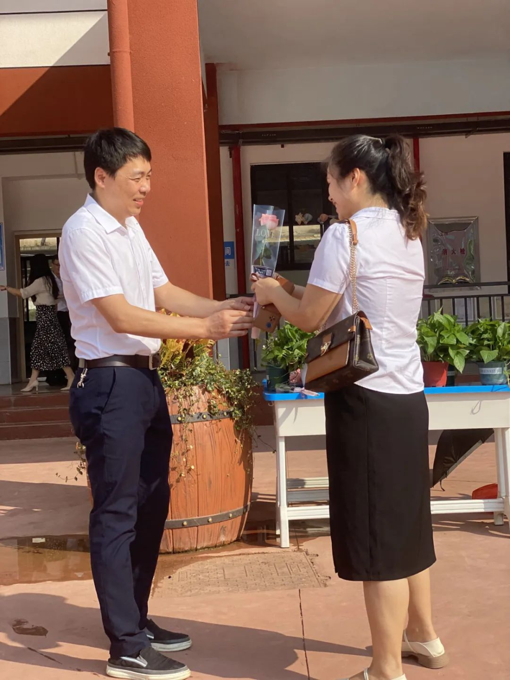 活动前,党总支书记、校长徐宇球一行在明达楼门前,为老师们献鲜花、送奶茶、道祝福,教师们的脸上绽放出幸福的笑脸。