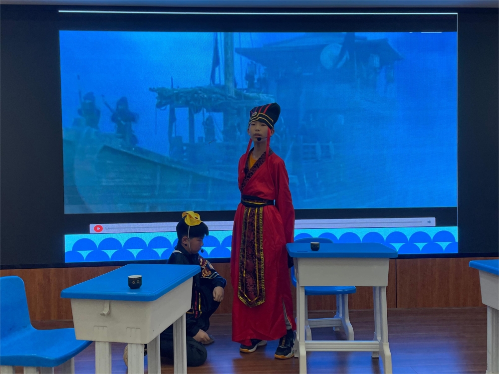 此外,1903班和2001班的学生们分别演绎了《三国演义》中的《草船借箭》,他们通过精准的台词和生动的表演,再现了诸葛亮智借东风、草船借箭的经典场景。