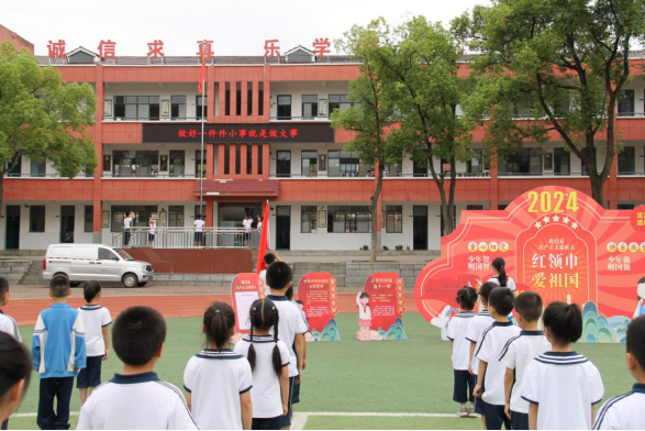 在鲜艳的队旗下,队员们右手握拳,在少先队大队长付李语霏的带领下, 一声声响亮的宣誓声,坚定而有力,一张张稚嫩的脸庞,严肃而认真。