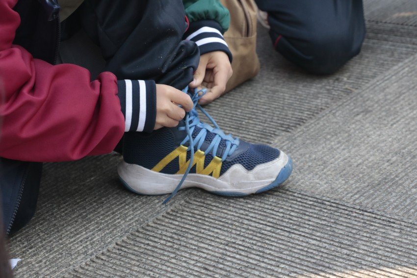 三年级系鞋带比赛现场的气氛既紧张又激烈。大家全神贯注地拿起鞋带,像针线一般穿梭在孔洞中。孩子们时而神采飞扬,时而紧皱眉头,鞋带在一双双巧手的牵引下,化身为扎实的蝴蝶结。
