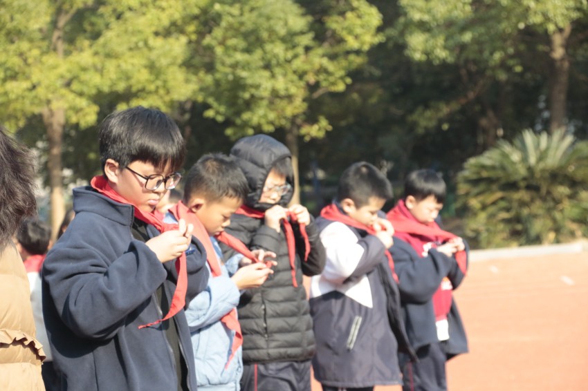 四年级的队员们精神抖擞,以最饱满的状态投入比赛中。他们将红领巾披在肩,加上灵活的小手,红领巾在指尖舞动,有的孩子手法娴熟,动作流畅,展现出了扎实的基本功,不一会儿红领巾就被整齐地系在了脖子上。那一抹鲜艳的红色,如同火焰,在孩子们的胸前燃烧。