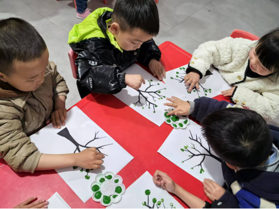 活动前,老师对孩子们进行“植树节”主题教育,了解植树节的由来。随后孩子们通过绘画、手指点画、给大树“添衣”等方式表达对植树节的理解。
