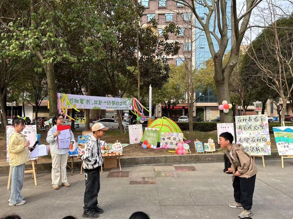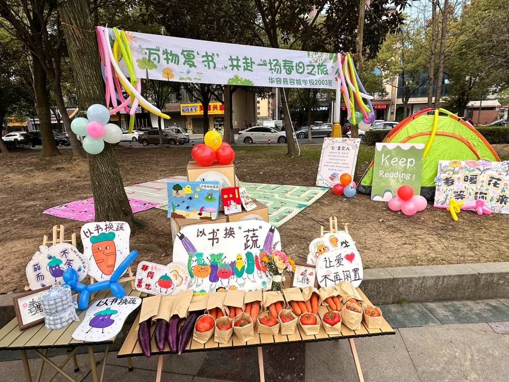 当经典名著“撞上”西兰花、胡萝卜,阅读还能多有趣?3月22日,华容县容城学校2003班在人民广场举办“万物复‘书’”春日阅读活动,40余名师生家长通过“文学版你演我猜”“以书换蔬”等创意环节,让书香与春意撞出火花。