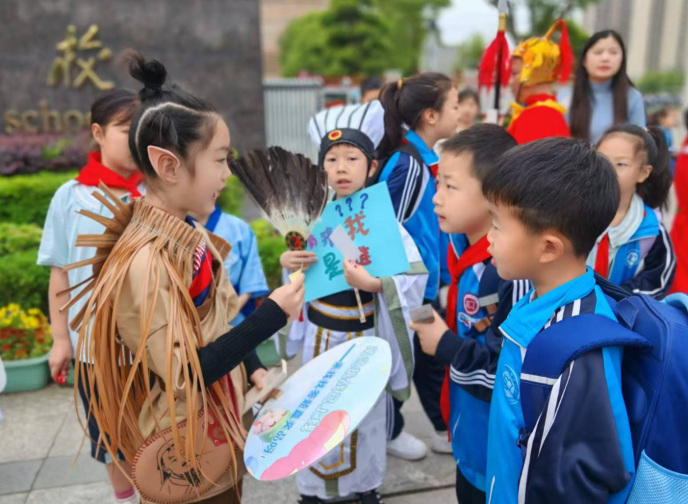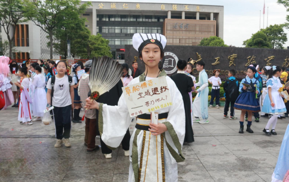 清晨,校园里洋溢着浓厚的书香氛围。同学们身着精心准备的服装,化身经典文学人物。校门口,头戴金箍的"孙悟空"挥舞金箍棒,引来阵阵喝彩;身着古装的"林黛玉"手执花锄,吟诵着《葬花吟》;还有"阿廖沙""保尔·柯察金"等外国文学经典人物的精彩演绎。这些生动形象的展示,让文学作品中的人物"活"了起来,引得师生们驻足观赏。