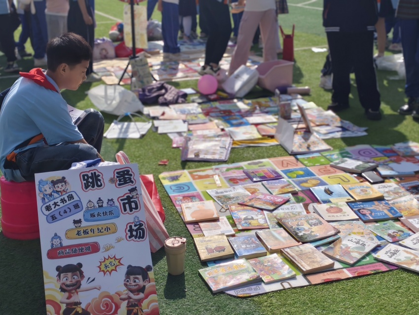 “小掌柜”化身江湖百晓生,在书海江湖中亮出独门绝技。“四大名著连环画全套五元带回家!”“买《夏洛的网》送蚕宝宝啦!”“童梦书局”的双胞胎姐妹花独创rap推销法,踩着《孤勇者》节拍唱响:“爆笑漫画五块五,知识能量百分补!”银铃般的笑声里,夹杂着“小顾客”们认真的博弈:“姐姐,《小王子》三块钱行吗?我用两颗千纸鹤星星币换!”春日的阳光掠过那些认真讨价还价的小脑袋,在写满“以书为舟,遨游星河”的彩绘标语牌上投下跃动的光斑。