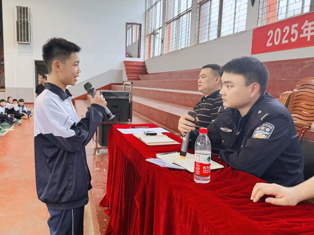 在提问互动环节,同学们热情高涨,纷纷踊跃举手提问。“回家路上,遇到有人跟踪该如何应对?”“同学借钱不还,怎样运用法律手段维权?” 面对同学们抛出的一个个问题,朱亮警官均耐心细致地一一作答,现场气氛热烈非凡。