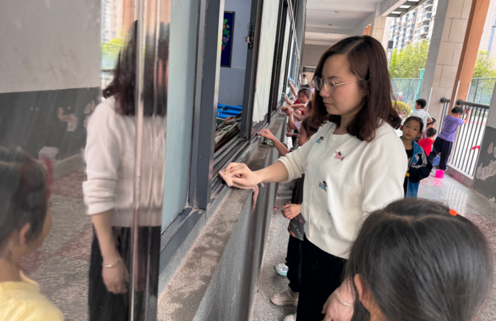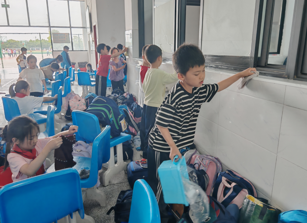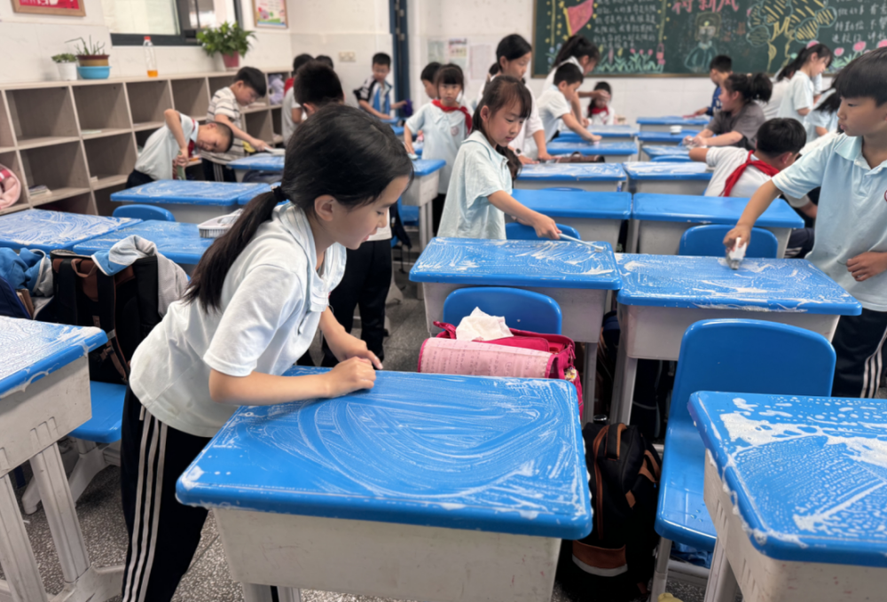 “我自己擦的桌子最干净!”一名满头大汗的男孩骄傲地向同学展示成果,教室里洋溢着欢声笑语。