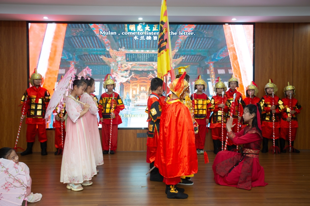 传统故事《狐假虎威》《木兰从军》与西方童话《Snow White》《The Wolf Is Coming》同台竞演。2106班用英式台词诠释木兰替父从军的家国情怀;2204班将绘本《Brown Bear》改编为手偶互动剧,童趣十足;2207班则以星空为幕布,用音乐剧演绎《Twinkle Twinkle Little Star》,点燃全场。